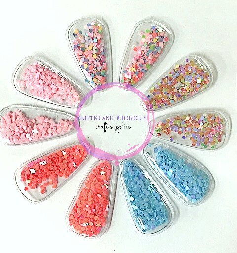 Shaker snap clip covers. DOES NOT INCLUDE SNAP CLIPS. 10 pack includes: 2 blue heart confetti, 2 light pink heart confetti, 2 fuchsia heart confetti , 2 multi heart confetti, 2 circle confetti explosion.