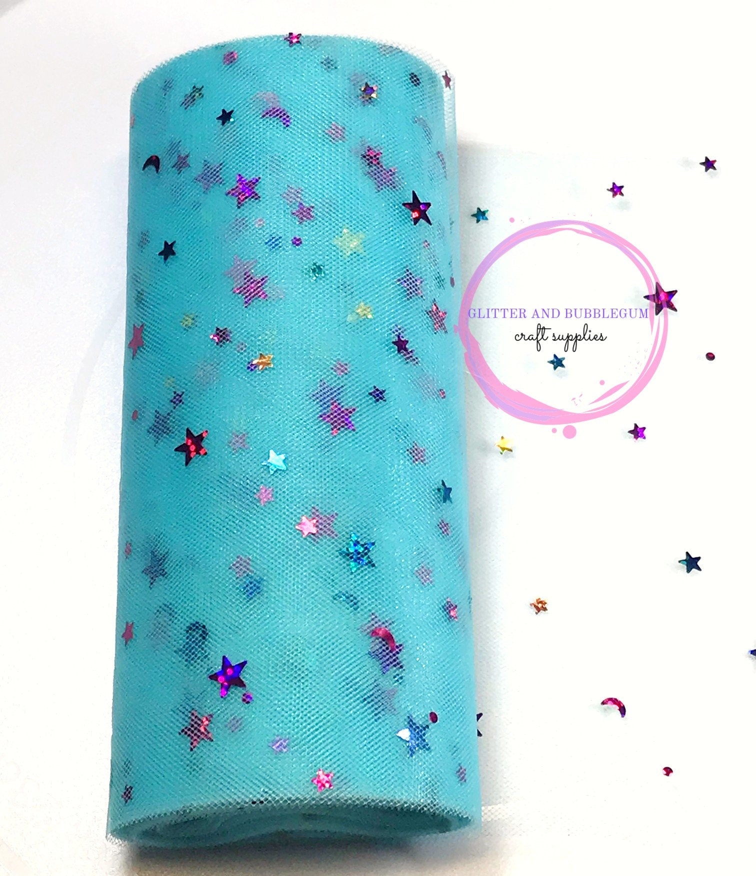 Fun times await with this mint blue and stars tulle. The roll is 6 inches wide and 10 yards long. This is great for all your decorating or crafting needs. Great for tutus and other items.