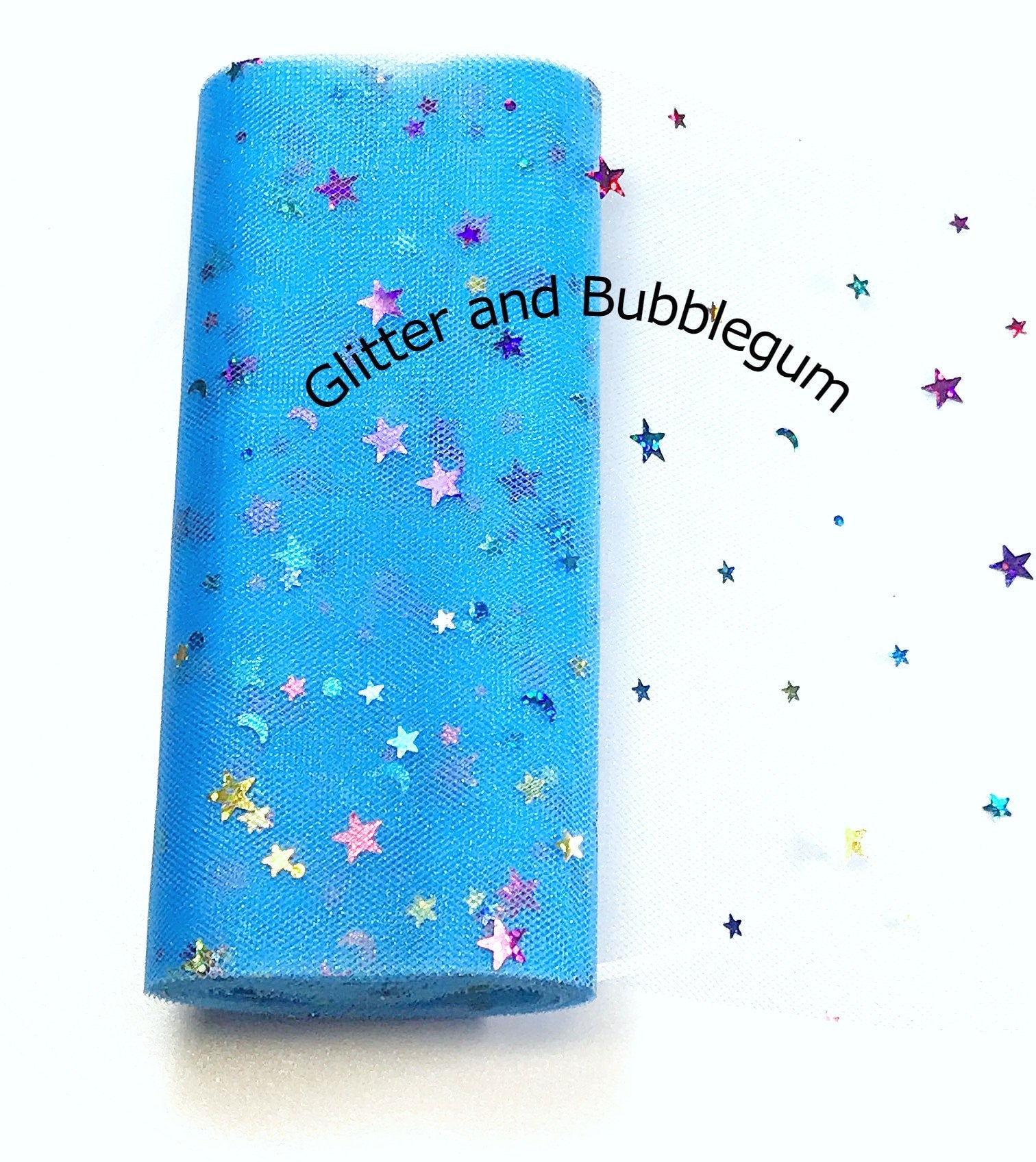 Fun times await with this lake blue moon and stars tulle. The roll is 6 inches wide and 10 yards long. This is great for all your decorating or crafting needs. Great for tutus and other items.