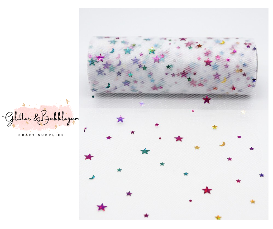 Tulle 6 inch wide with moon and stars white 10 yards